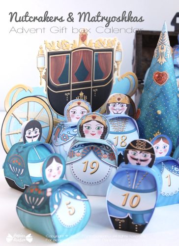 That’s why I wanted to use this theme to create a new Advent calendar to build a fabulous winter ball where everything would be sumptuously decorated. Here are those 24 gift boxes in the shape of matryoshaks & their dance partners that will help you make small surprise all along December to your loved ones. I added Christmas tree and a coach to complete the scenery of this winter ball.
