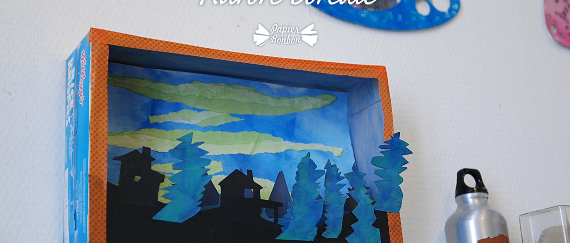 Nous avons transformé une boîte de céréales en scène de forêt de sapins derrière laquelle on peut glisser une petite lumière led. La scène se compose d’un premier plan de silhouettes noires de sapins et de chalets, collées sur un rebord conservé sur le côté de la boîte ; et d’une seconde languette paysage avec des silhouettes plus simples collés à l’intérieur de la boîte, au milieu. Dans un second temps, je l’ai un peu habillé de masking tape et il faudrait aussi peindre les côtés.