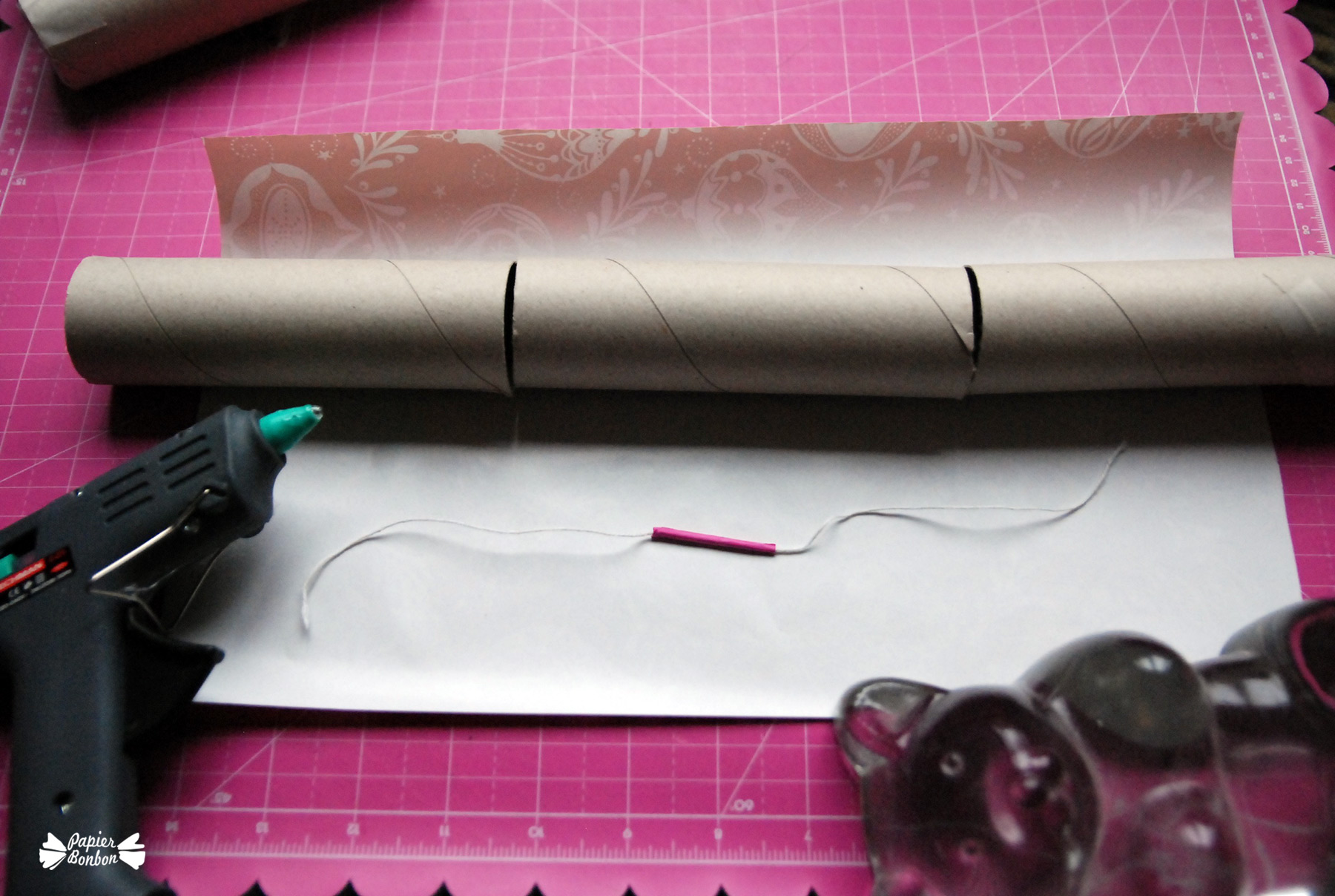 • Fix the cracker with hot glue, on the extremities og the string, on the edga of the wrapping paper. Let cool down.